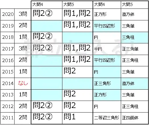 大問5で三平方の定理が不要だったのは10年で2回だけ。どちらも柱体である。