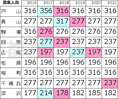 青字は昨年度より1クラス募集数が増えた年。赤字はその逆、1クラス減った年だ。