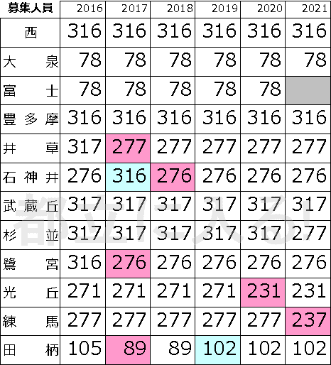 西、豊多摩、武蔵丘、杉並は募集数に変化なし。
