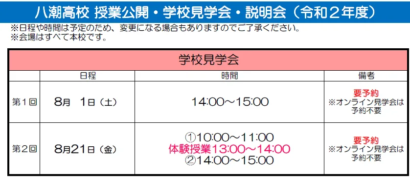 8月以降で従来の学校説明会・見学会を実施する高校も半数程度だろうか、判明しだしている。