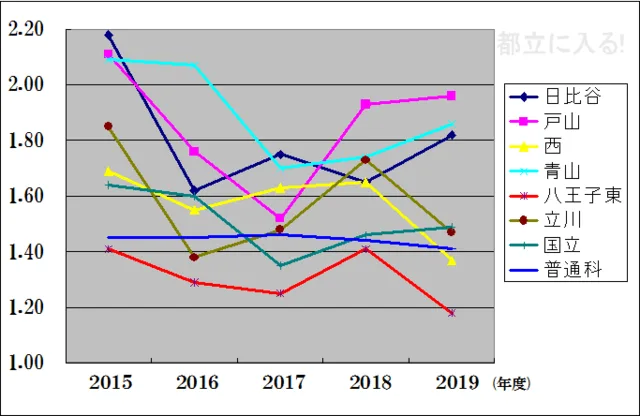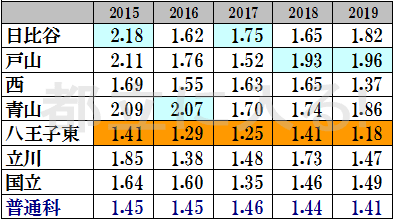 2015年度入試から、今春2019年度入試までの男子実倍率をまとめたものだ。
