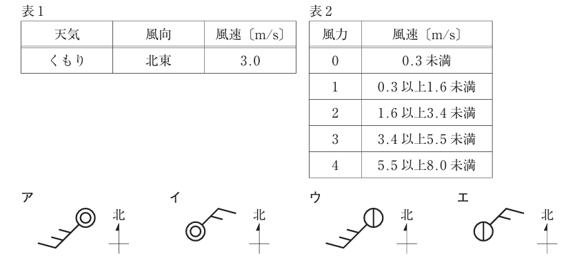 2013年は天気と風向きを問う問題が出たが、天気図記号は出ていません。