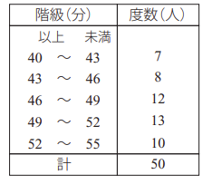 右の表は,マラソン大会の10kmの部に出場した50人の